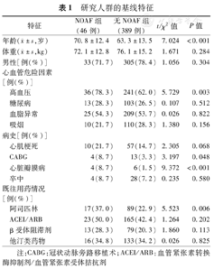 | 特征 | NOAF组(46例) | 无NOAF组(389例) | t/χ2值 | P值 | |