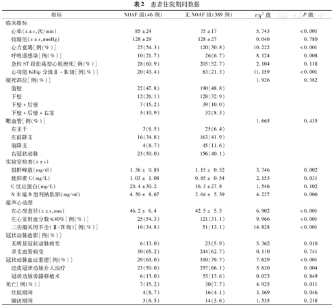 | 指标 | NOAF组(46例) | 无NOAF组(389例) | t/χ2值 | P值 | |
