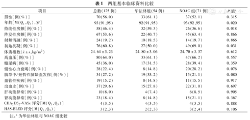 | 项目 | 总数(125例) | 华法林组(54例) | NOAC组(71例) | P值a |