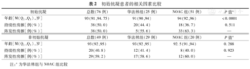 华法林组患者较NOAC组年龄小、持续性房颤更多,而NOAC组初始抗凝比例较高,两组其他临床资料比较差异无统计学意义,见表1、表2。