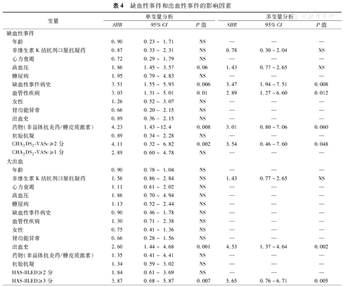 采用竞争风险分析模型分析,发现发生缺血性终点事件的患者既往有缺血性事件、血管性疾病和药物史可能是影响预后终点事件的危险因素,有出血史可能是影响预后发生大出血的危险因素。再将可能的危险因素进行多因素分析,发现既往缺血性事件、血管性疾病、CHA2DS2-VASc≥2分是发生缺血性终点事件的独立预测因子,既往出血病史、HAS-BLED≥3分是大出血终点事件的独立预测因子(均为P<0.05),见表4。
