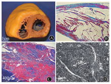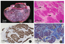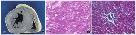 IDC病理形态学主要诊断依据[5]:心脏质量增加;左心室或双心室腔显著扩大,心室壁变薄(图1A),可有附壁血栓。组织学表型不特异,可有心肌细胞萎缩、肥大及空泡变性,细胞核多形性,间质纤维组织呈小片或灶状增生(图1B、图1C和图1D)。