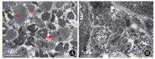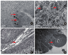 A:肌丝结构紊乱,肌丝束结构不良,肌节过度收缩,可见"致密带"(箭头所示)(图片来源于作者研究的标本,尚未发表);B:间质中大量Ⅰ型胶原(箭头所示)(图片来源于作者的研究标本,尚未发表);C:两细胞间间质增宽,间质中可见TCs(箭头所示)[6];D:心肌细胞代谢异常,糖原增多(箭头所示)(图片来源于作者的研究标本,尚未发表)