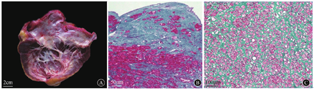 PRCM的病理形态学主要诊断依据[12]:大体表现为心脏外形常呈锥形、僵硬,体积及质量无明显增加,双心房扩张,尤以左房显著,心房内膜增厚呈瓷白色,左心室腔无扩张或狭小或轻度扩张(图5A),可有附壁血栓形成。组织学改变可呈单侧或双侧心室受累,病程晚期可表现为心腔闭塞。心内膜及心肌间质的纤维化,以心内膜为主要表现者,心内膜纤维组织增生,并有向心肌内延伸和锚入现象(图5B),心内膜表层为玻璃样变的纤维组织,中层则以密集的胶原纤维为主,下层为较多的成纤维细胞及纤细的胶原,并插入心肌间,与其间的纤维组织相连包绕心肌细胞,增生的纤维组织中可出现钙化、小血管增生及炎细胞浸润,心内膜下的心肌间质纤维化常局限于心壁的内2/3层;以心肌间质纤维化为主要表现者,心内膜增厚不明显,心肌间质纤维组织大量增生,呈蜂巢状包绕心肌细胞(图5C),可融合成小灶瘢痕,心肌细胞常有变形及纤维分隔所致的极向紊乱。