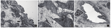 PRCM超微形态学表型[6]多样,心肌细胞及间质成分的改变均较复杂,间质有不同类型胶原成分的沉积(主要为Ⅰ型及Ⅲ型),心肌细胞存在继发性改变,还有多种发育不良表现。心内膜、心肌细胞及血管周围的间质成分大量增生,其中细胞成分较少,主要为均质的细胞外基质,散在粗大的Ⅰ型胶原纤维束,杂乱无序排列(图6)。
