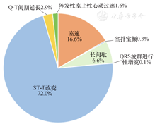 统计显示,多数ST段抬高型心肌梗死(ST-elevated myocardial infarction,STEMI)患者死于院外。2017年欧洲心脏病学会[3]和2013年美国心脏病学会[4]分别发表的关于STEMI的管理指南中指出,影响患者再灌注的主要原因是就医延迟、院内延迟及区域间差异。我国STEMI现状也类似。因此,降低STEMI患者死亡率的关键是缩短患者呼救时间(就医延迟和院内延迟)和改善区域不平衡[5]。监测设备的使用和人工智能平台的建立,为缩短呼救时间和平衡区域间的治疗差异提供了可能。我们前期成功申请到国家科技部"数字化诊疗装备研发"项目(急性心肌梗死的数字化诊疗解决方案),联合国内多家心电高科技公司进行科技攻关。针对高、中、低危患者给予不同的可穿戴设备进行远程心电监测,将患者心电图实时发送至云平台并进行人工智能化的自动预警,如果疑似STEMI,可得到早期诊断和及时处理。同时可结合移动PACS系统(远程会诊系统、远程信息传输系统、实时影像传输系统等),从而缩短患者救治时间并改善区域间救治不平衡。我们项目合作单位的初步临床研发结果显示,2017年,25万人次的心电记录,250亿次心动分析中,系统自动识别1 043万次异常报警,并筛选出符合危机预警标准的进行电话预警(预警电话呼出17.96万次),预警患者38万人次。其中,危急值预警总数为38 080例,其中ST-T改变27 399例(占72.0%,图1),共抢救了218例患者,其中急性冠状动脉综合征36例(尚未发表数据,表1)。我院心电诊断中心数据显示,2017年1月1日至2018年10月31日共有效戴机6 533例,成功实现了实时电话预警3 852次(尚未发表数据)。因此,随着远程心电监测系统应用范围的扩大,相信会有更多患者从中获益。