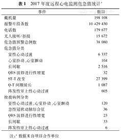 心律失常是常见的心血管疾病,室性心动过速/心室扑动/心室颤动和心脏骤停是引起心源性猝死的主要原因,已成为青壮年人群的主要杀手[6]。2017年美国心脏病学会在预防心源性猝死的指南中指出,针对心源性猝死高危患者,如尚未达到植入式心律转复除颤仪(implantable cardioverter-defibrillator,ICD)植入指征,或有ICD植入指征但存在ICD禁忌证的患者,建议使用可穿戴式远程心电监测系统,可及时发现并处理[7]。此外,还可用于围术期监测及抗心律失常药物疗效观察。在ICD植入患者的随访中发现,远程家庭监控系统的心律失常发生和报告方面,较传统随访方式更快捷安全[8]。我们项目合作单位的数据也显示,2017年通过人工智能化远程心电监测预警室性心动过速6 337例(占16.6%),成功抢救了室性心动过速/心室扑动/心室颤动共120例,各类停搏33例(表1)。