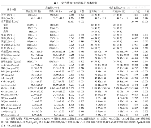 蒙古族和汉族居民的人口学特征、生活方式因素和部分生化指标如表1所示。高血压人群中,蒙古族和汉族居民在教育程度、DBiL、Alb、Glob、ALP、ChE、Cr和FPG上差异有统计学意义(均为P<0.05);非高血压人群中,蒙古族和汉族居民在教育程度、食盐量、DBiL、Alb、Glob、ALP、ChE、Cr、CO2和TC上差异有统计学意义(均为P<0.05);高血压与非高血压人群中,蒙古族和汉族居民在性别、吸烟、饮酒、饮茶、锻炼状况、BMI、腰臀比、舒张压、心率和TG等方面均无显著性差异(均为P>0.05)。