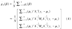 一般地,(4)式中包含估计方程的个数会多于参数的个数,因此求解gN=0无法得到β的唯一估计。二次推断函数运用Hanson的广义矩估计的思想,将扩展得分函数中的估计方程进行最优合并。基于(4)式,二次推断函数被定义为: