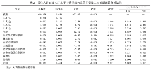 男性人群血清ALT水平与糖尿病关系的多变量二次推断函数分析结果