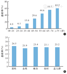 在高血压患病率的流行病学分布上,最突出的是年龄和地区间的差异。首先,高血压患病率随年龄增加呈显著升高的趋势(图1A),18~34岁人群高血压患病率为5%,35~44岁年龄组的高血压患病率已接近1/6,65~74岁年龄组有高血压的人数超过50%。35~64岁是高血压患病率上升最快的年龄段。在全国31个省、自治区或直辖市中,高血压患病率最低的是湖南,城市人群为14.5%,农村人群为15.9%,城市人群高血压患病率最高的是北京,为36%,农村人群最高的是上海为39.2%。男性高血压患病率高于女性。城市和农村间患病率差异较小(图1B)。