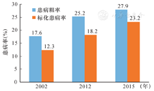 近20年来,我国开展了多次全国性的18岁以上人群抽样调查,2002—2015年间进行的三次高血压抽样调查结果显示,人群高血压患病率总体呈上升趋势[4,5](图2)。