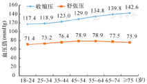 18岁及以上人群的收缩压随年龄增长呈升高趋势,而舒张压在55岁前随年龄增长呈升高趋势,55岁后随年龄增长舒张压平均水平有所下降(图4)。男性血压平均水平高于女性,城市与农村差异无显著性[4]。