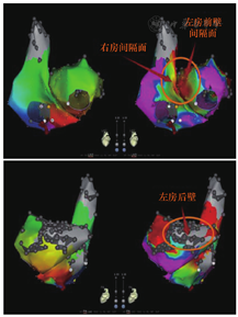 可见左房后壁肺静脉区完全瘢痕,前壁间隔面大片瘢痕,余左房游离壁、下壁组织电压正常;同时右房间隔面可见大片瘢痕