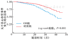 平均随访(28.3±15.4)个月,失访29例(9.7%)。随访期间,共有107例(35.7%)患者发生MACCE,包括12例(4.0%)死亡、50例(16.7%)因HF再入院、18例(6.0%)急性心肌梗死和10例(3.3%)卒中(表2)。Kaplan-Meier生存分析和Log-rank检验结果提示,OH组患者的因HF再入院(27.0%比11.5%,P=0.001)、卒中(6.0比2.0%,P=0.037)和MACCE发生率(53.0%比27.0%,P<0.001)(图1)均显著高于对照组,但两组的全因死亡率(5.0%比3.5%,P=0.532)、急性心肌梗死(8.0%比5.0%,P=0.302)和恶性心律失常(7.0%比5.0%,P=0.480)发生率无明显差别。