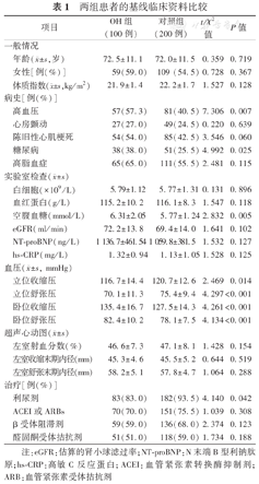 老年HF患者中,OH的发生率为43.2%。与对照组相比,OH组患者较多合并高血压(57.8%比40.5%)和糖尿病(38.0%比25.5%),空腹血糖、立位收缩压和舒张压、卧位收缩压和舒张压水平均较高,但应用利尿剂比例较低(83.0%比93.5%)(均为P<0.05),其余基线资料两组间无明显差异(均为P>0.05)(表1)。