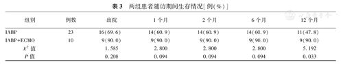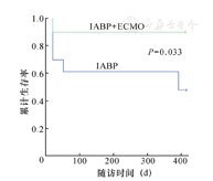 随访1年,ECMO+IABP组院外生存率高于IABP组(90.0%比47.8%,χ2=5.192,P=0.033),差异有统计学意义(表3、图1)。