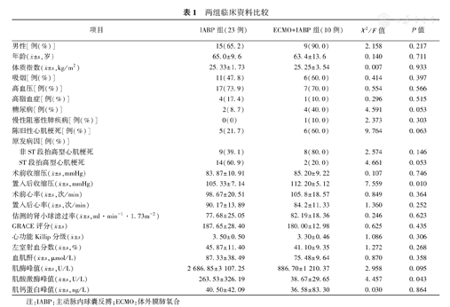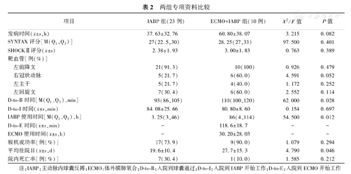 | 项目 | IABP组(23例) | ECMO+IABP组(10例) | χ2/F值 | P值 | |