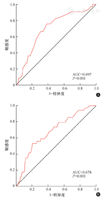 将LVEF、SYNTAX评分、肾功能不全、血管狭窄程度、糖尿病、吸烟以及年龄等因素纳入Cox回归模型进行比较,结果提示MACE事件的发生主要与LVEF (HR=0.95,95%CI:0.92~0.99,P=0.008)及SYNTAX评分(HR=1.05,95%CI:1.01~1.08,P=0.007)有关。ROC曲线分析发现,LVEF(AUC=0.697,P<0.001)和SYNTAX评分(AUC=0.678,P=0.001)均可预测MACE发生风险(图1)。