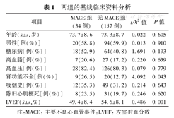 两组的一般临床资料比较发现,MACE组的肾功能不全率明显多于无MACE组(P=0.043),而左室射血分数(left ventricular ejection fraction,LVEF)明显低于无MACE组(P<0.01),见表1。
