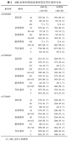 | 基因型 | 模型 | AMI组(410例) | 对照组(484例) | |