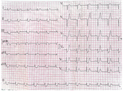 荷兰鹿特丹心内科医生de Winter等于2008年回顾分析1 532例诊断为ACS并经冠状动脉造影证实左前降支近段闭塞患者的心电图,其中30例未出现典型STEMI超急性期心电图改变,而呈现ST段上斜型压低伴T波高尖型改变[4]。典型心电图改变为胸导联V1~V6呈ST段上斜型压低≥0.1 mV,T波高尖且对称,其他表现有aVR导联J点抬高0.2~2 mm,下壁导联ST段中度压低等[5],如图1所示。进一步研究发现,此类心电图表现在前降支闭塞患者中的发生率约为2%,与前降支闭塞的典型STEMI相比,患者发病年龄较轻、男性较多、高脂血症比例更高[6]。此后相关文章以de Winter心电图改变或综合征来命名此类心电图改变。