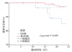 HD组患者住院早期死亡率明显高于非HD组患者(20.0%比5.0%,χ2=8.040,P=0.005)。顺利出院患者随访2年,失访率9.1%,平均随访(22.9±3.2)个月。HD组和非HD组随访期间分别死亡4例和3例,HD组患者近中期死亡率高于非HD组(14.3%比2.6%,Log-rank P=0.009),见图2。