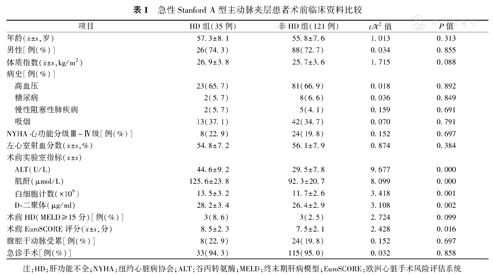回顾性分析青岛市市立医院2014年5月至2018年5月156例接受外科手术的急性Stanford A型主动脉夹层患者围术期资料。采用终末期肝病模型(MELD)评分评估患者术后肝功能,并分为HD组35例(MELD评分≥15分)和非HD组121例(MELD评分<14分)。所有患者围术期主要指标进行单因素分析和多因素logistic回归分析,并比较两组患者的预后。