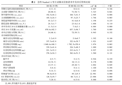 | 主动脉弓置换手术[例(%)] | 28(80.0) | 71(58.7) | 5.323 | 0.021 | |