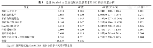 本研究还证实,术前ALT水平升高、体外循环时间延长和术中及术后24 h红细胞输注量增加是急性Stanford A型主动脉夹层患者术后发生HD的独立危险因素。