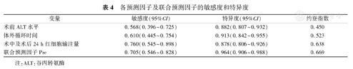 ROC曲线分析结果显示,联合预测因子Pre(AUC=0.927,95%CI:0.876~0.978,P=0.000)对术后HD的预测作用分别高于术前ALT水平(AUC=0.756,95%CI:0.652~0.861,P=0.000)、体外循环时间(AUC=0.781,95%CI:0.687~0.876,P=0.000)和术中及术后24 h红细胞输注量(AUC=0.830,95%CI:0.753~0.907,P=0.000),见图1、表4。