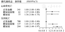 与正常血糖人群相比,糖尿病前期和糖尿病人群的CVD死亡和全因死亡风险增加,有统计学差异(P<0.05)。糖尿病前期和糖尿病人群发生CVD死亡风险的HRs(95%CI)分别为1.37(1.04~1.80)和1.36(1.06~1.75);全因死亡风险的HRs(95%CI)分别为1.41(1.17~1.69)和1.68(1.44~1.97),见图1。