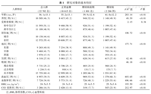 | 人群特征 | 总人群(22 702名) | 正常血糖(18 615名) | 糖尿病前期(1 801名) | 糖尿病(2 286例) | F/χ2值 | P值 | |