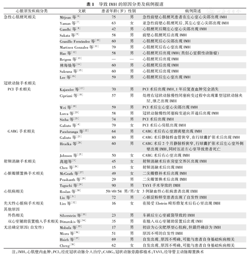 按照病因可分为自发性和继发性两种,继发性主要是指心血管相关手术操作造成的心肌直接损伤或冠状动脉破裂所致的血液在心肌内积聚。IMH多以临床病例报道的形式出现在国内外文献中,经梳理近20年以来的文献报道,按照心脏原发疾病分类主要有以下几类:(1)急性心肌梗死相关:此类病例报道最多,绝大部分发生在心肌梗死急性期,也有少部分发生在心肌梗死亚急性期,甚至后期;(2)冠状动脉手术相关:主要指经皮冠状动脉介入术或冠状动脉旁路移植术相关;(3)射频消融手术相关:导管射频消融的并发症有传导阻滞、心脏穿孔所致的心脏压塞等,单纯出现心肌内血肿并发症的报道极少;(4)心脏瓣膜置换手术相关;(5)心肌病相关:心肌病出现自发心肌血肿的报道更加罕见,文献中只见零星报道;(6)先天性心脏病手术相关;(7)其他原因;(8)不明原因(表1)。