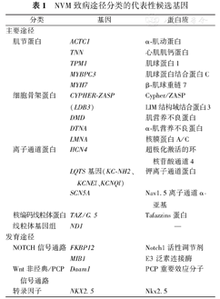 NVM的分子遗传致病机制是复杂的。NVM患者常被发现具有其他心肌病亚型[扩张型心肌病(dilated cardiomyopathy,DCM)、肥厚型心肌病(hypertrophic cardiomyopathy,HCM)]家族史,表明NVM可能与其他心肌病具有共同的遗传机制[17]。因此,与其他心肌病类似,NVM也具有"共同致病途径"[18]。不同的是,NVM的致病途径不是单一的,在大多数情况下,NVM的发生可能是主要途径(例如肌节基因)和干扰发育过程的发育途径(例如NOTCH信号通路)的共同结果[19]。且临床证据表明,发生多基因突变的病例更为普遍,致病基因之间可能具有协同性。几个常见且重要的候选致病基因见表1。