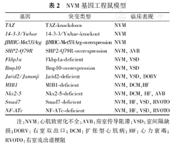 除了前文提到的小鼠模型外,还有许多NVM小鼠模型已被构建应用,例如Jarid2基因敲除小鼠、14-3-3/Ywhae基因敲除小鼠[43,44]、过表达SHP2-Q79R(Noonan综合征)小鼠[45]和过表达βMHC-Met531Arg小鼠[46]等。目前主要的NVM基因工程鼠模型种类,见表2。