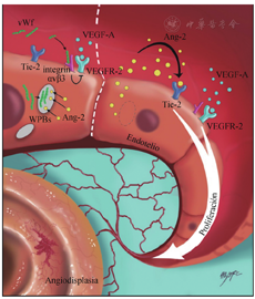 血管生成由内皮细胞迁移、增殖所启动,并在血管平滑肌细胞包绕下成熟,其中诱导早期内皮迁移、增殖的血管内皮生长因子(vascular endothelial growth factor,VEGF)与促进平滑肌细胞增殖的血管生成素1(angiopoietin 1,Ang-1)的协调稳态对健康血管形成至关重要,过表达VEGF和(或)抑制Ang-1表达均可诱发AD[10]。近年体内外研究发现,虽然抑制vWF表达可促进内皮细胞增殖、迁移和血管生成,增加局部血管密度,但作为血管成熟标志的血管平滑肌细胞却生长缓慢;内皮细胞的韦贝尔-帕拉德小体储存着vWF多聚体、Ang-2、半乳糖凝集素3等多种血管活性成分,HMWM-vWFs缺乏主要通过以下机制诱导AD:(1)HMWM-vWFs缺乏可增加Ang-2释放,Ang-2竞争性拮抗Ang-1并与Tie-2受体结合,协同VEGF受体2(VEGFR-2)破坏血管稳定,促进血管增生,即HMWM-vWFs缺乏通过Ang-2/Tie-2/VEGFR-2通路促进AD形成;(2)整合素αvβ3可抑制VEGFR-2活性及其下游信号传导,抑制血管增生;而HMWM-vWFs缺乏导致其在细胞膜表面含量下降,VEGFR-2信号传导增强,促进血管增生;(3)HMWM-vWFs缺乏增加半乳糖凝集素3释放,其分别通过与整合素αvβ3结合而抑制其活性和上调VEGFR-2磷酸化而促进下游信号转导,诱发血管增生[11](图1)。此外,严重AS可导致胃肠道血流低灌注及其黏膜下局部缺血缺氧,引发微小血管持续扩张,加之慢性缺氧诱导血管内皮分泌大量的VEGF、Ang-2,共同促发AD形成[12]。