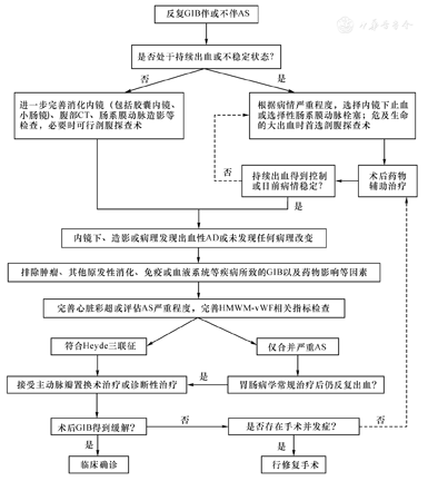 Tsuchiya等[20]总结37例接受主动脉瓣置换术的HS个案报道显示,所有病例术前均存在反复GIB,而7例(18.9%)患者术前未被诊断为AD,其中3例术后未复发GIB;28例(75.7%)术前未被诊断为AVWS,其中23例(82.1%)术后随访期内未复发GIB。鉴于HS病理机制的复杂性、相关诊查手段的有限准确率及可获得性,其临床诊断是否必须满足AD或AVWS以及主动脉瓣置换术诊断性治疗的可行性值得进一步研究。