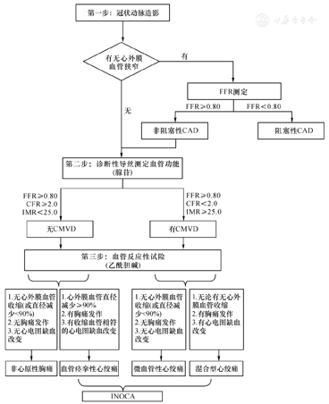 目前对于CMVD的诊断流程尚无统一标准,最近欧洲心脏病学会冠状动脉生理学组[26]给出了关于INOCA的介入诊断流程(图1),为CMVD的诊断提供了参考。