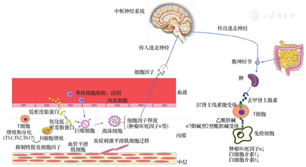 血管内皮功能受损,血浆中低密度脂蛋白(LDL)渗透内膜下并滞留,LDL被氧化成ox-LDL,同时单核细胞在趋化因子及粘附分子的作用下浸入血管壁并分化成巨噬细胞,巨噬细胞吞噬ox-LDL形成泡沫细胞释放炎症因子。释放到外周的炎症介质刺激迷走神经感觉神经元,激活后的迷走神经将信号传递给中枢,中枢经整合后发出迷走传出信号,通过腹腔神经节激活脾神经,脾交感神经兴奋释放去甲肾上腺素(NE),NE与T细胞上的β2肾上腺素能受体(β2AR)结合促使T细胞合成并释放乙酰胆碱(ACh), ACh作用于免疫细胞上的α7nAChR,促进免疫细胞的增殖和分化,抑制炎症因子释放。同时炎症刺激下,血管平滑肌细胞(VSMCs)向内膜迁移。表达于内皮细胞及VSMCs上的α7nAChR的激活也通过调节内皮血管新生及平滑肌细胞迁移抑制炎症因子及活性氧自由基的释放