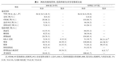 本研究为回顾性分析。纳入2009—2013年在阜外医院因AMI住院行冠状动脉造影,并有再次住院记录的青年(≤40岁)患者,共186例。按照随诊期间是否出现RMI,分为RMI组(29例)和对照组(157例)。RMI定义根据2019年急性ST段抬高型心肌梗死诊断和治疗指南,为AMI 28 d后再次出现的心肌梗死[3]。本研究符合医学伦理要求。