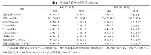 复诊时,对照组TC、TG水平均较初诊时下降(均为P<0.01),LDL-C水平也较初诊时下降[(2.3±1.0)mmol/L比(2.6±1.0)mmol/L,P<0.05],而RMI组均无明显下降(均为P>0.05)。复诊时,RMI组的空腹血糖、hs-CRP、白细胞计数和中性粒细胞计数均高于对照组(均为P<0.05)。见表2。