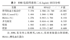 将停用抗血小板治疗,复诊时LDL-C、HbA1c水平,多支病变,复诊时仍在吸烟,复诊时肥胖,进行是否发生RMI的多因素二元logistic回归分析。结果表明,停用抗血小板治疗是RMI的独立危险因素(OR=7.378,P<0.001);复诊时的高LDL-C水平是RMI的独立危险因素(OR=1.444,P=0.027)。而复诊时的HbA1c水平、多支病变、复诊时仍在吸烟和肥胖均不是RMI的独立危险因素。见表3。