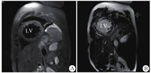 LV:左心室;A:T2压脂示室间隔及左室心肌多发斑片状水肿信号;B:延迟强化示弥漫多发延迟强化
