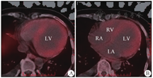 LV:左心室;LA:左心房;RV:右心室;RA:右心房;A、B:心肌弥漫性摄取炎症显像剂