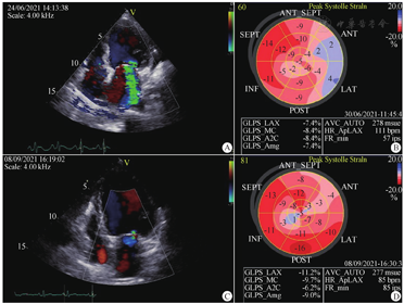 A:病初心尖四腔心切面显示大量二尖瓣反流;B:病初左室纵向应变异常;C:治疗2个月后心尖四腔心切面显示少量二尖瓣反流;D:治疗2个月后左室纵向应变改善