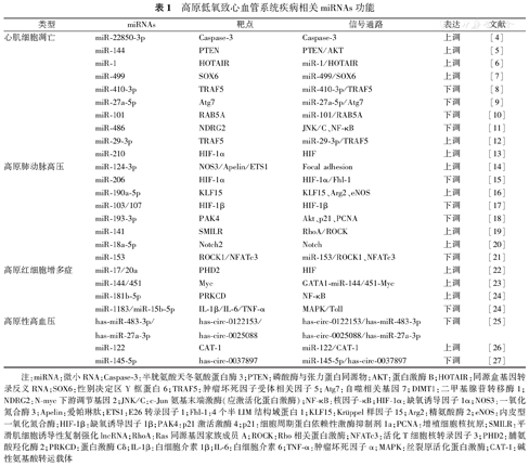高原环境中机体对低氧产生急性应激反应,体液中可促进血压升高的生物活性物质儿茶酚胺类增多以及心排血量增加引起的血压升高称为高原性高血压,但目前全世界尚无高原性高血压的统一定义共识或指南。高原性高血压发病机制主要有血液黏滞性增大、交感神经激活、NO和H2S代谢异常以及HIF。红细胞数量和体积变化是导致血液黏滞性改变的根本原因,已证实miR-130a-3p与红细胞计数、红细胞比容呈正相关[38]。低氧暴露可引起机体血液重新分布,导致交感神经活动明显增强,肾素-血管紧张素-醛固酮系统(renin angiotensin aldosterone system,RAAS)被激活。miRNA是RAAS的重要调节因子,Chu等[39]探讨了原发性高血压(essential hypertension,EH)患者miR-136水平与RAAS生化标志物之间的相关性,发现EH患者外周血中miR-136表达明显升高,miR-136表达与RAAS生化标志物呈显著负相关,高表达的miR-136预示着高血压患者用药后的预后良好。He等[25]也证实,在EH患者中RAAS相关的has-miR-483-3p和has-miR-27a-3p下调,而与RAAS相关蛋白has-circ-0122153和has-circ-0025088上调,涉及has-circ-0122153/has-miR-483-3p和has-circ-0025088/has-miR-27a-3p轴是潜在的EH通路。气体信号分子NO和H2S参与了高原性高血压病理生理过程,且随病情发展出现升高趋势,已成为高原性高血压风险预警分子及关键调节分子。Zhang等[26]研究发现,EH患者血浆中miR-122显著升高,CAT-1水平显著降低,miR-122通过抑制CAT-1蛋白的表达降低L-精氨酸转运,从而影响内皮细胞NO合成与释放,miR-122的高表达似乎是高血压患者内皮功能障碍的危险因素。高原性高血压与EH有类似的病理生理过程,miRNA在EH中发挥的重要调控作用已有大量研究佐证,但高原性高血压与miRNA相关研究尚处起步阶段,期望通过上述对miRNA与EH总结为高原性高血压与miRNA研究提供借鉴。