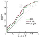 ±s表示,组间比较采用独立样本t检验;计数资料以百分构成比表示,组间比较采用χ2检验或Fisher精确检验。变量之间的相关性使用Pearson或Spearman相关分析。独立预测因素采用多因素logistic回归分析。绘制受试者工作特征(receiver operating characteristic,ROC)曲线分析FAR和FIB曲线下面积、阳性预测值和阴性预测值。双侧P<0.05为差异有统计学意义。