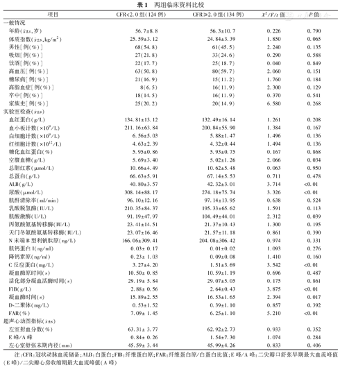 | 项目 | CFR<2.0组(124例) | CFR≥2.0组(134例) | χ2/F/t值 | P值 | |