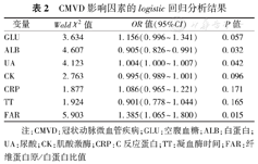 注:CMVD:冠状动脉微血管疾病;GLU:空腹血糖;ALB:白蛋白;UA:尿酸;CK:肌酸激酶;CRP:C反应蛋白;TT:凝血酶时间;FAR:纤维蛋白原/白蛋白比值